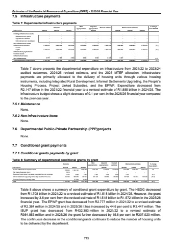 Estimates of the Provincial Revenue and Expenditure (EPRE) - 2025/26 Financial Year 7.5 Infrastructure payments Table 7: Departmental infrastructure payments Outcome Main appropriationAdjusted appropriation Revised estimate Medium-term estimates % change from 2024/25R thousand 2021/22 2022/23 2023/24 2025/26 2026/27 2027/28Existing infrastructure assets %u2013 %u2013 %u2013 %u2013 %u2013 %u2013 %u2013 %u2013 %u2013 Maintenance and repairs %u2013 %u2013 %u2013 %u2013 %u2013 %u2013 %u2013 %u2013 %u2013 Upgrades and additions %u2013 %u2013 %u2013 %u2013 %u2013 %u2013 %u2013 %u2013 %u2013 Refurbishment and rehabilitation %u2013 %u2013 %u2013 %u2013 %u2013 %u2013 %u2013 %u2013 %u2013 New infrastructure assets %u2013 %u2013 %u2013 %u2013 %u2013 %u2013 %u2013 %u2013 %u2013 Infrastructure transfers 2 145 017 2 046 069 1 915 615 1 879 524 1 882 957 1 882 940 1 880 905 1 696 694 1 773 421 (0.1)Current %u2013 %u2013 %u2013 %u2013 %u2013 %u2013 %u2013 %u2013 %u2013 Capital 2 145 017 2 046 069 1 915 615 1 879 524 1 882 957 1 882 940 1 880 905 1 696 694 1 773 421 (0.1)Infrastructure payments for financial assets %u2013 %u2013 %u2013 %u2013 %u2013 %u2013 %u2013 %u2013 %u2013Infrastructure leases %u2013 %u2013 %u2013 %u2013 %u2013 %u2013 %u2013 %u2013 %u2013Non infrastructure 2 777 2 989 2 364 2 384 2 384 2 429 3 447 %u2013 %u2013 41.9Total department infrastructure 2 147 794 2 049 058 1 917 979 1 881 908 1 885 341 1 885 369 1 884 352 1 696 694 1 773 421 (0.1)2024/25 Table 7 above presents the departmental expenditure on infrastructure from 2021/22 to 2023/24 audited outcomes, 2024/25 revised estimate, and the 2025 MTEF allocation. Infrastructure payments are primarily allocated to the delivery of housing units through various housing instruments, including Integrated Rural Development, Informal Settlements Upgrading, the People%u2019s Housing Process, Project Linked Subsidies, and the EPWP. Expenditure decreased from R2.147 billion in the 2021/22 financial year to a revised estimate of R1.885 billion in 2024/25. The infrastructure budget shows a slight decrease of 0.1 per cent in the 2025/26 financial year compared to the previous year. 7.5.1 Maintenance None.7.5.2 Non infrastructure items None. 7.6 Departmental Public-Private Partnership (PPP)projects None. 7.7 Conditional grant payments 7.7.1 Conditional grants payments by grant Table 8: Summary of departmental conditional grants by grant Outcome Mainappropriation Adjusted appropriation Revised estimate 2021/22 2022/23 2023/24 2024/25 2025/26 2026/27 2027/281 708 805 1 592 762 1 405 845 1 518 104 1 518 104 1 518 104 1 572 985 1 593 320 1 665 372 3.6 3 819 - - - - - - - 2 777 2 988 2 364 2 384 2 384 2 384 3 447 - 44.6 - 432 393 386 059 492 917 361 420 364 853 364 853 307 920 103 374 108 049 (15.6) 67 248 16 853 - - - - - - - 2 147 794 2 049 057 1 917 979 1 881 908 1 885 341 1 885 341 1 884 352 1 696 694 1 773 421 (0.1) Expanded Public Works Programme Intergrated Grant for provinces Total Informal Settlements Upgrading Partnership Grant For Provinces Provincial Emergency Housing Grant R thousand % change from 2024/25 Human Settlements Development Grant Title Deeds Restoration Grant Medium-term estimates Table 8 above shows a summary of conditional grant expenditure by grant. The HSDG decreased from R1.708 billion in 2021/22 to a revised estimate of R1.518 billion in 2024/25. However, the grant increased by 3.6 per cent from the revised estimate of R1.518 billion to R1.572 billion in the 2025/26 financial year. The EPWP grant has decreased from R2.777 million in 2021/22 to a revised estimate of R2.384 million in 2024/25 and in 2025/26 it has increased by 44.6 per cent to R3.447 million. The ISUP grant has decreased from R432.393 million in 2021/22 to a revised estimate of R364.853 million and in 2025/26 the grant further decreased by 15.6 per cent to R307.920 million. The continuous decrease in the conditional grants continues to reduce the number of housing units to be delivered by the department. 715