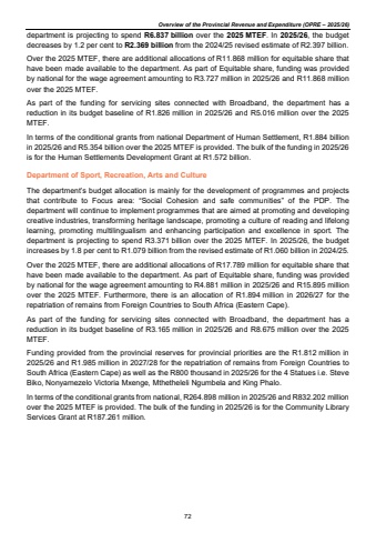 Overview of the Provincial Revenue and Expenditure (OPRE %u2013 2025/26)department is projecting to spend R6.837 billion over the 2025 MTEF. In 2025/26, the budget decreases by 1.2 per cent to R2.369 billion from the 2024/25 revised estimate of R2.397 billion. Over the 2025 MTEF, there are additional allocations of R11.868 million for equitable share that have been made available to the department. As part of Equitable share, funding was provided by national for the wage agreement amounting to R3.727 million in 2025/26 and R11.868 million over the 2025 MTEF. As part of the funding for servicing sites connected with Broadband, the department has a reduction in its budget baseline of R1.826 million in 2025/26 and R5.016 million over the 2025 MTEF. In terms of the conditional grants from national Department of Human Settlement, R1.884 billion in 2025/26 and R5.354 billion over the 2025 MTEF is provided. The bulk of the funding in 2025/26 is for the Human Settlements Development Grant at R1.572 billion. Department of Sport, Recreation, Arts and Culture The department%u2019s budget allocation is mainly for the development of programmes and projects that contribute to Focus area: %u201cSocial Cohesion and safe communities%u201d of the PDP. The department will continue to implement programmes that are aimed at promoting and developing creative industries, transforming heritage landscape, promoting a culture of reading and lifelong learning, promoting multilingualism and enhancing participation and excellence in sport. The department is projecting to spend R3.371 billion over the 2025 MTEF. In 2025/26, the budget increases by 1.8 per cent to R1.079 billion from the revised estimate of R1.060 billion in 2024/25. Over the 2025 MTEF, there are additional allocations of R17.789 million for equitable share that have been made available to the department. As part of Equitable share, funding was provided by national for the wage agreement amounting to R4.881 million in 2025/26 and R15.895 million over the 2025 MTEF. Furthermore, there is an allocation of R1.894 million in 2026/27 for the repatriation of remains from Foreign Countries to South Africa (Eastern Cape). As part of the funding for servicing sites connected with Broadband, the department has a reduction in its budget baseline of R3.165 million in 2025/26 and R8.675 million over the 2025 MTEF. Funding provided from the provincial reserves for provincial priorities are the R1.812 million in 2025/26 and R1.985 million in 2027/28 for the repatriation of remains from Foreign Countries to South Africa (Eastern Cape) as well as the R800 thousand in 2025/26 for the 4 Statues i.e. Steve Biko, Nonyamezelo Victoria Mxenge, Mthetheleli Ngumbela and King Phalo. In terms of the conditional grants from national, R264.898 million in 2025/26 and R832.202 million over the 2025 MTEF is provided. The bulk of the funding in 2025/26 is for the Community Library Services Grant at R187.261 million. 72