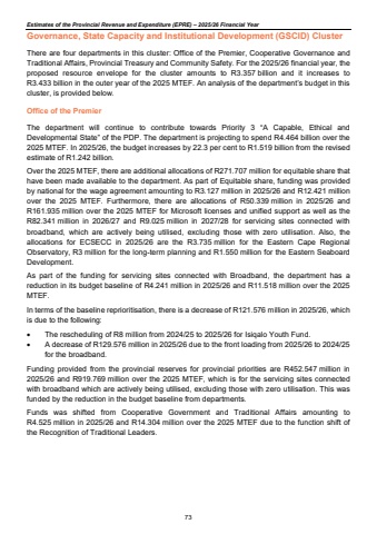 Estimates of the Provincial Revenue and Expenditure (EPRE) %u2013 2025/26 Financial YearGovernance, State Capacity and Institutional Development (GSCID) Cluster There are four departments in this cluster: Office of the Premier, Cooperative Governance and Traditional Affairs, Provincial Treasury and Community Safety. For the 2025/26 financial year, the proposed resource envelope for the cluster amounts to R3.357 billion and it increases to R3.433 billion in the outer year of the 2025 MTEF. An analysis of the department%u2019s budget in this cluster, is provided below. Office of the Premier The department will continue to contribute towards Priority 3 %u201cA Capable, Ethical and Developmental State%u201d of the PDP. The department is projecting to spend R4.464 billion over the 2025 MTEF. In 2025/26, the budget increases by 22.3 per cent to R1.519 billion from the revised estimate of R1.242 billion. Over the 2025 MTEF, there are additional allocations of R271.707 million for equitable share that have been made available to the department. As part of Equitable share, funding was provided by national for the wage agreement amounting to R3.127 million in 2025/26 and R12.421 million over the 2025 MTEF. Furthermore, there are allocations of R50.339 million in 2025/26 and R161.935 million over the 2025 MTEF for Microsoft licenses and unified support as well as the R82.341 million in 2026/27 and R9.025 million in 2027/28 for servicing sites connected with broadband, which are actively being utilised, excluding those with zero utilisation. Also, the allocations for ECSECC in 2025/26 are the R3.735 million for the Eastern Cape Regional Observatory, R3 million for the long-term planning and R1.550 million for the Eastern Seaboard Development. As part of the funding for servicing sites connected with Broadband, the department has a reduction in its budget baseline of R4.241 million in 2025/26 and R11.518 million over the 2025 MTEF. In terms of the baseline reprioritisation, there is a decrease of R121.576 million in 2025/26, which is due to the following: %uf0b7 The rescheduling of R8 million from 2024/25 to 2025/26 for Isiqalo Youth Fund.%uf0b7 A decrease of R129.576 million in 2025/26 due to the front loading from 2025/26 to 2024/25for the broadband.Funding provided from the provincial reserves for provincial priorities are R452.547 million in 2025/26 and R919.769 million over the 2025 MTEF, which is for the servicing sites connected with broadband which are actively being utilised, excluding those with zero utilisation. This was funded by the reduction in the budget baseline from departments. Funds was shifted from Cooperative Government and Traditional Affairs amounting to R4.525 million in 2025/26 and R14.304 million over the 2025 MTEF due to the function shift of the Recognition of Traditional Leaders. 73